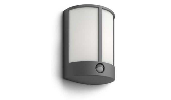 Philips Stock LED ārsienu lampa antracīta pelēkā krāsā ir veidota no izturīga spiedlējuma alumīnija, un tai ir kustību sensors jūsu drošībai. Izteiktā pusapļa laternas konstrukcija maksimāli kliedē gaismu, izgaismojot apkārtējo vidi ar izkliedētu un silti baltu gaismu.
